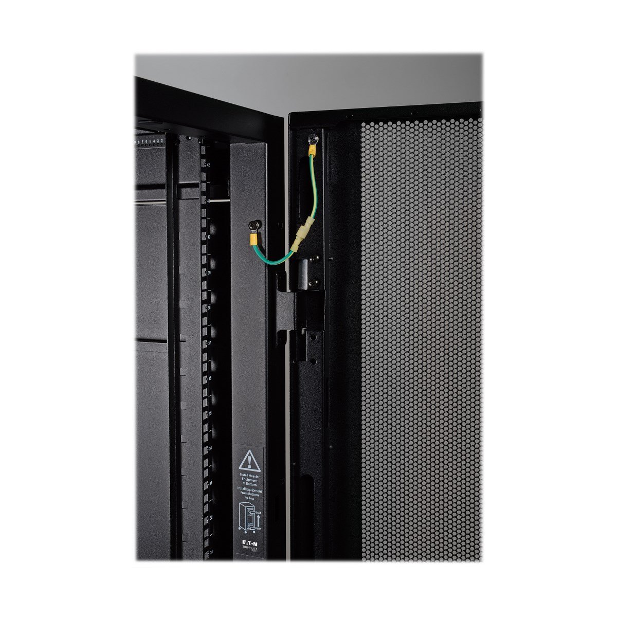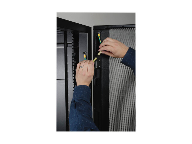 Alle Komponenten des SR48UBWD sind mit dem Gehäuserahmen geerdet. Für den Anschluss an den Erdungsanschluss des Standorts sind vordere und hintere Erdungspunkte mit Gewinde vorgesehen. Die abnehmbaren vorderen und hinteren Türen sind mit schnell lösbaren Erdungskabeln ausgestattet.
