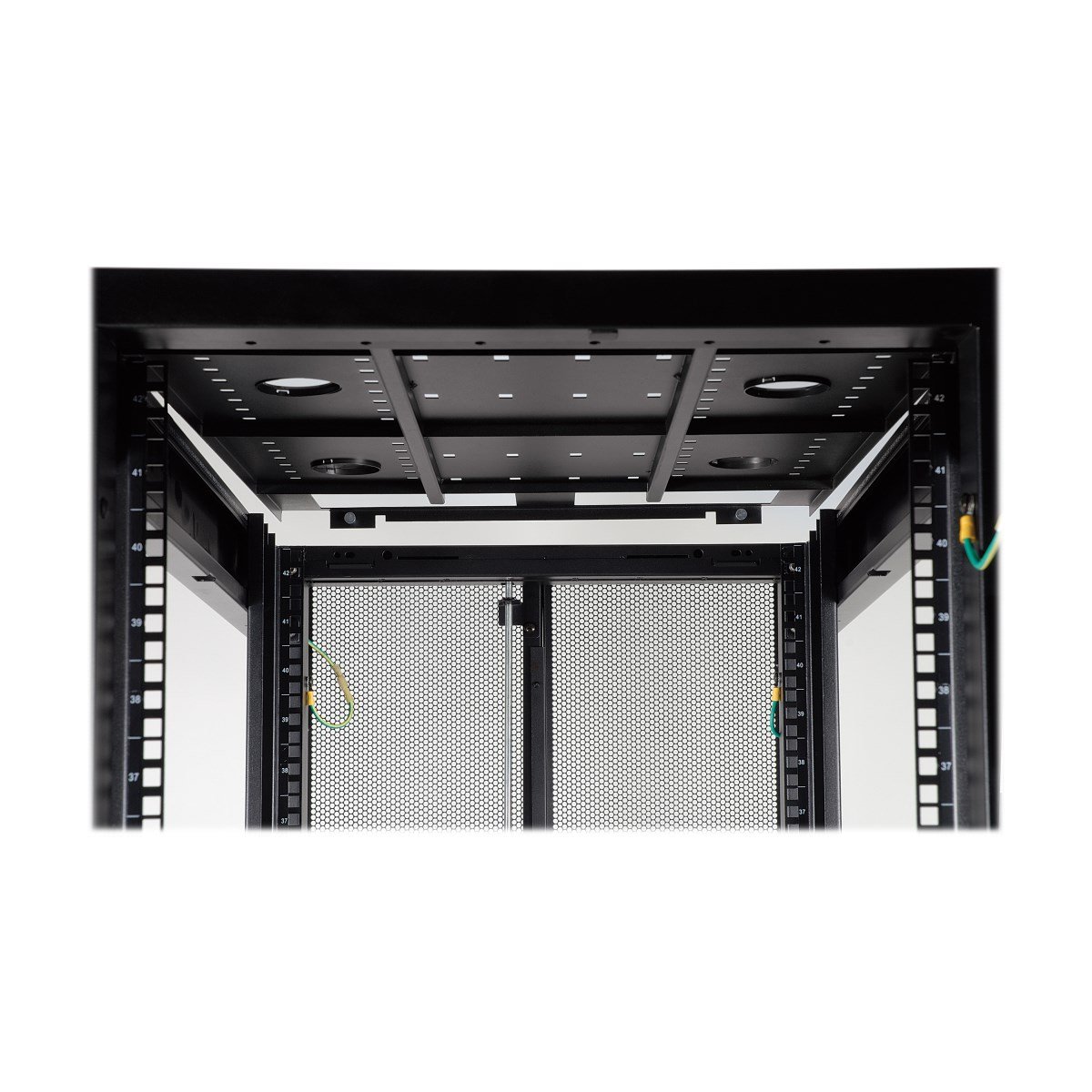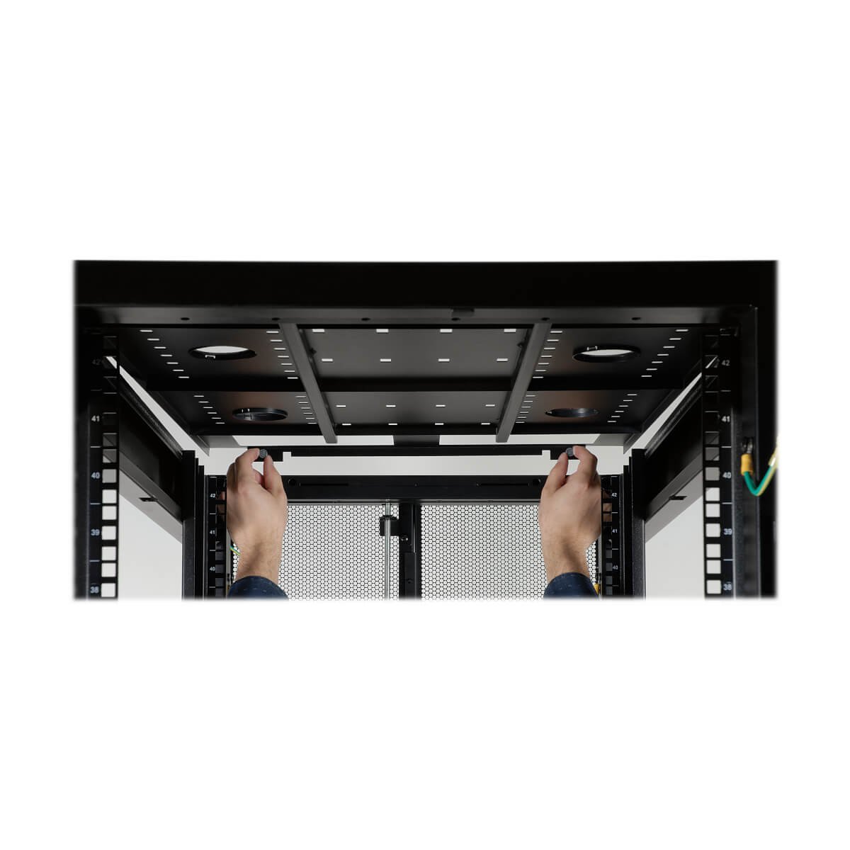 Die obere Platte des SR48UBWD ist belüftet, um warme Luft aus dem Gehäuse zu entfernen und kalte Luft durch Konvektion anzusaugen. Die obere Platte enthält Anschlüsse für die Kabelführung und kann ohne Werkzeug schnell entfernt werden. Um den Kabelzugang zu erleichtern, ist das SR45UBWD nach unten offen.