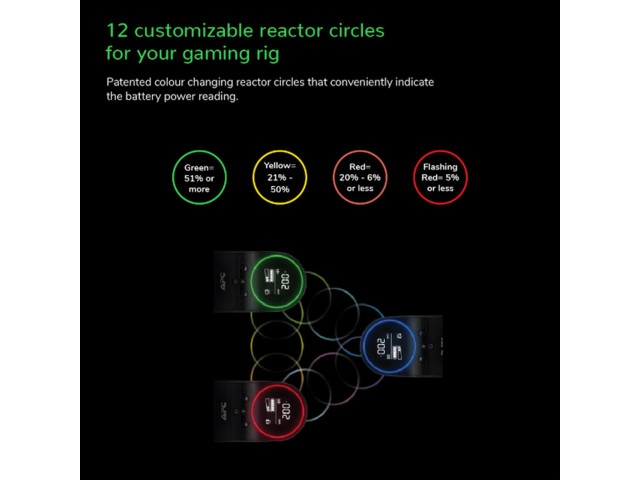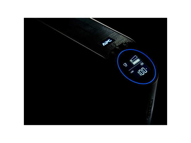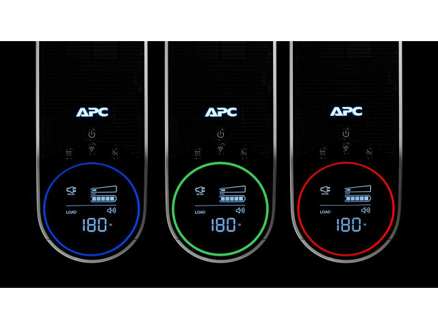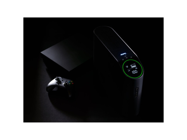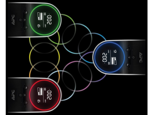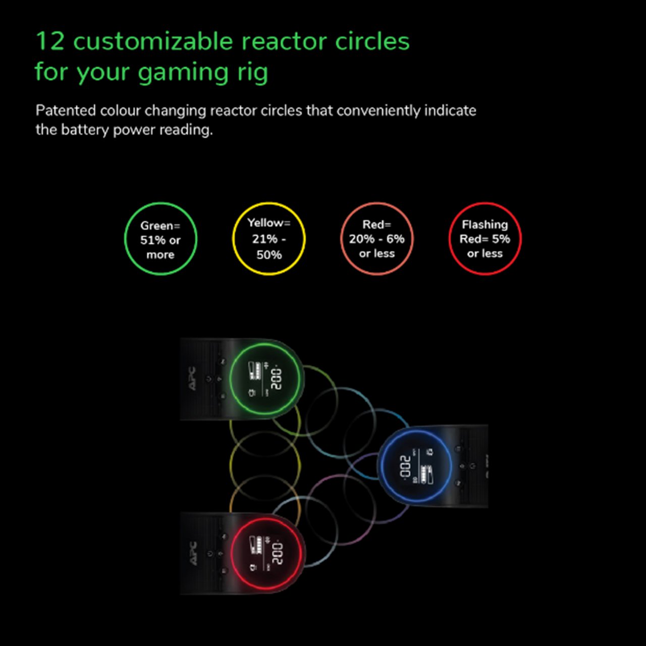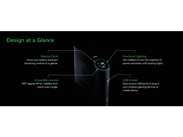Dank des zurückspringenden Reactor Circle, ausgestattet mit 12 anpassbaren RGB-LEDs, informiert Sie die APC-Notstromversorgung auf einen Blick über die verbleibende Laufzeit und angeschlossene Last.