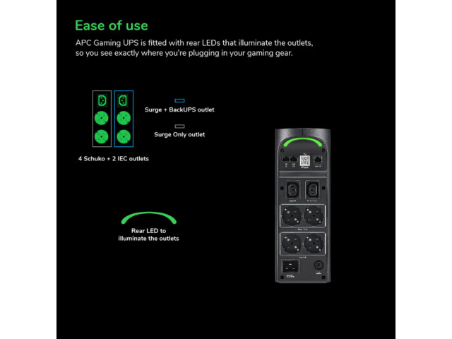 Die APC Gaming-USV ist auf der Rückseite mit LEDs ausgestattet, die die Buchsen beleuchten, sodass Sie genau sehen können, wo Sie Ihr Gaming-Equipment anschließen. Die hintere LED-Farbe stimmt mit dem Reaktorkreis überein und sorgt für einen stimmungsvollen Glanz hinter Ihrem Gaming-Setup.