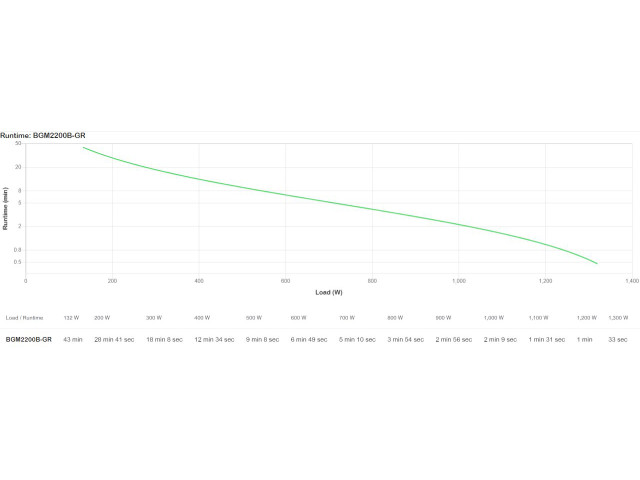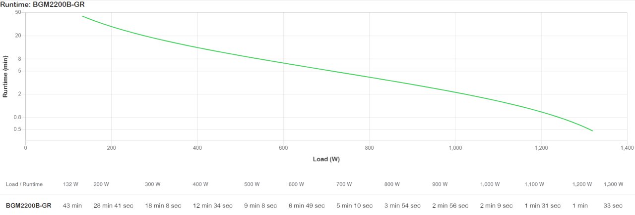 Die voraussichtliche Akkulaufzeit können Sie ganz einfach in der Laufzeitgrafik ablesen, die Sie zwischen den Produktbildern finden. Sie können ganz einfach erkennen, wie lange die USV bei einer bestimmten Last Notstrom liefert.