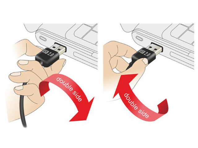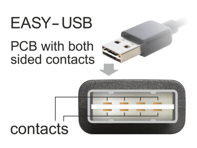 Dieses Kabel von Delock, mit EASY-USB Stecker, kann in beide Richtungen in die USB-A Buchse gesteckt werden. Somit kann der Stecker beidseitig verwendet werden und erleichtert das Einstecken.