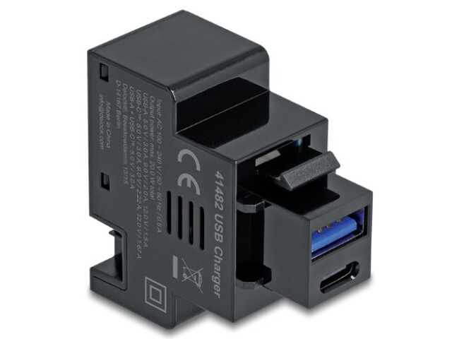 Dieses Modul von Delock stellt einen USB Typ-A und einen USB Type-C™ Power Delivery (PD) Ladeport zur Verfügung. Die USB Anschlüsse unterstützen gängige Schnellladeprotokolle. Angeschlossene Geräte können mit einer Leistung bis zu 20 W geladen werden. Durch die standardisierten Abmessungen ist es zur einfachen Snap-In Montage in verschiedene Halterungen, wie z. B. Keystone Patchpanel, Dosen oder Gehäuse geeignet.