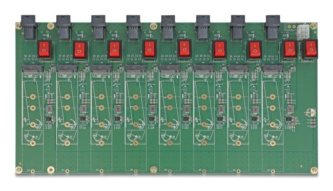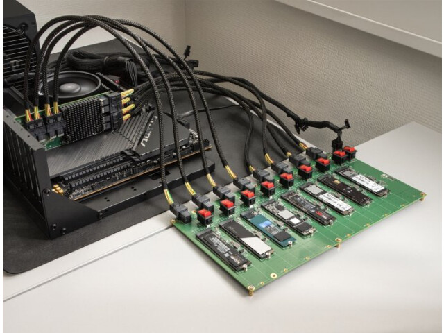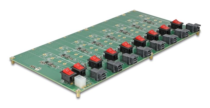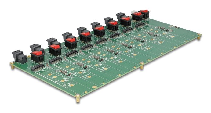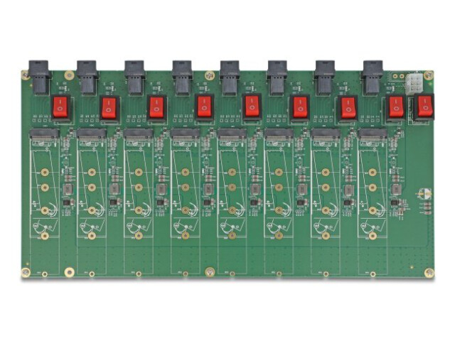 Mit dieser Testkarte kann die Leistung und Zuverlässigkeit der NVMe SSDs effizient evaluiert werden. Die acht M.2 Key M Schnittstellen ermöglichen flexible Testkonfigurationen, während das robuste Design für Langlebigkeit sorgt. Jeder M.2 Anschluss verfügt über einen separaten Ein- und Ausschalter, wodurch gezielte Tests einzelner SSDs problemlos möglich sind. Ein unverzichtbares Werkzeug für alle, die mit NVMe SSDs arbeiten.