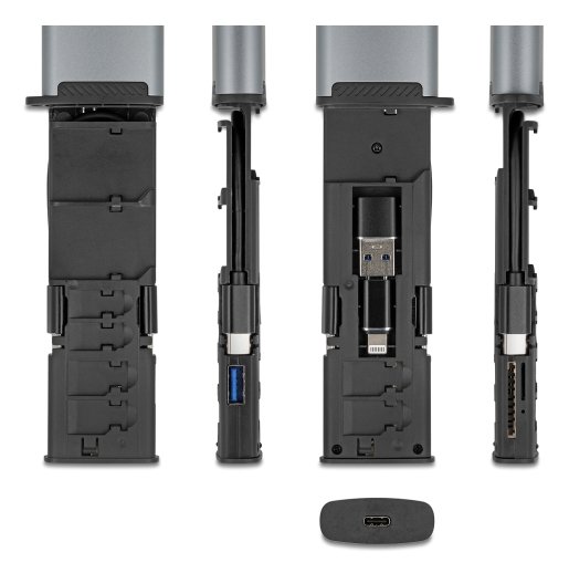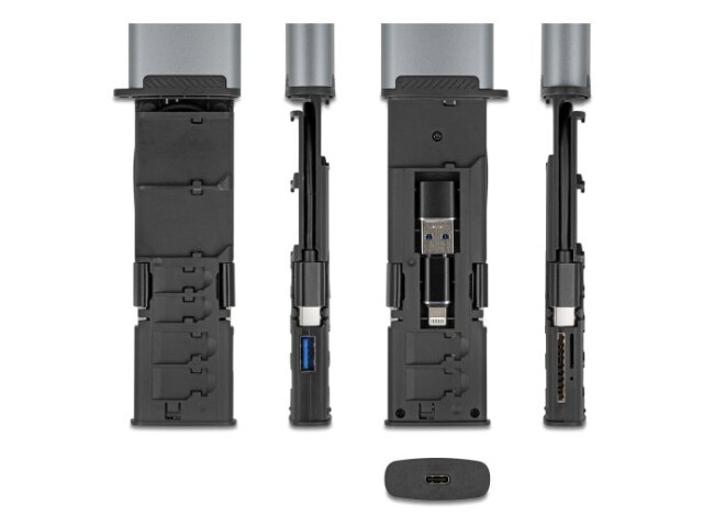 Neben der Funktion als Kartenleser dient das Gerät auch als sichere und platzsparende Aufbewahrungslösung für bis zu 9 Karten gleichzeitig. SD-, Micro SD- und Nano SIM-Karten lassen sich direkt im Gerät verstauen, sodass wichtige Speichermedien stets gut organisiert und griffbereit sind – ideal für den mobilen Einsatz oder als Ergänzung zur Datensicherung unterwegs.
