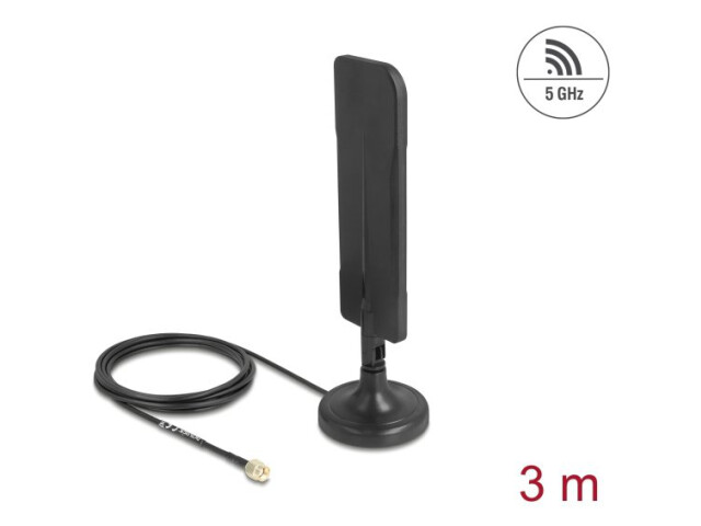 Delock WiFi 5,8 GHz Antenne RP-SMA Stecker 3 dBi omnidirektional mit Anschlusskabel RG-174 3 m mit Kippgelenk mit magnetischem Standfuß schwarz