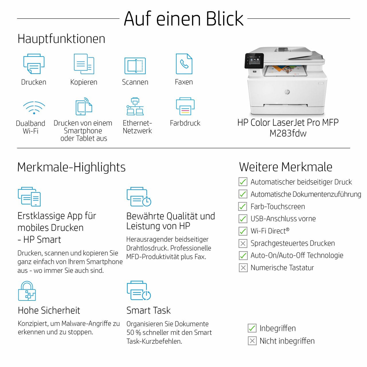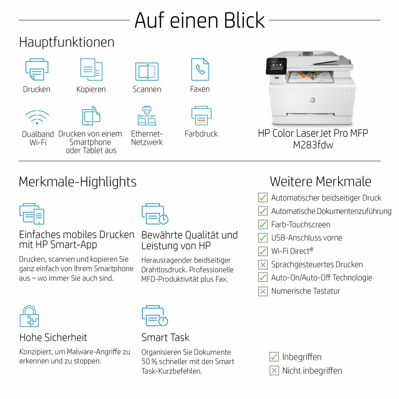 [7] HP Auto-On/Auto-Off-Technologie je nach Drucker und Einstellungen verfügbar; möglicherweise ist ein Firmware-Upgrade erforderlich. Der HP Color LaserJet Pro MFP M283fdw-Drucker ist Energy star 3.0-zertifiziert. Weitere Informationen finden Sie unter https://www.energystar.gov/sites/default/files/FINAL%20Version%203.0%20Imaging%20Equipment%20Specification%20Cover%20Memo.pdf. Für EPA Kaufberatung und Spezifikationen gehen Sie zu https://www.energystar.gov/products/office_equipment/imaging_equipment. Die HP Color LaserJet Pro MFP M283fdn bieten die gleiche Energieeffizienz wie die Energy Star 3.0 Zertifizierung und besitzen das alternative VOC-Zertifikat. Das HP Color LaserJet Pro MFP M282nw-Modell ist nicht für die ES3.0- und die VOC-Zertifizierung zugelassen, da es die Anforderungen für Duplex-Drucker nicht erfüllt.