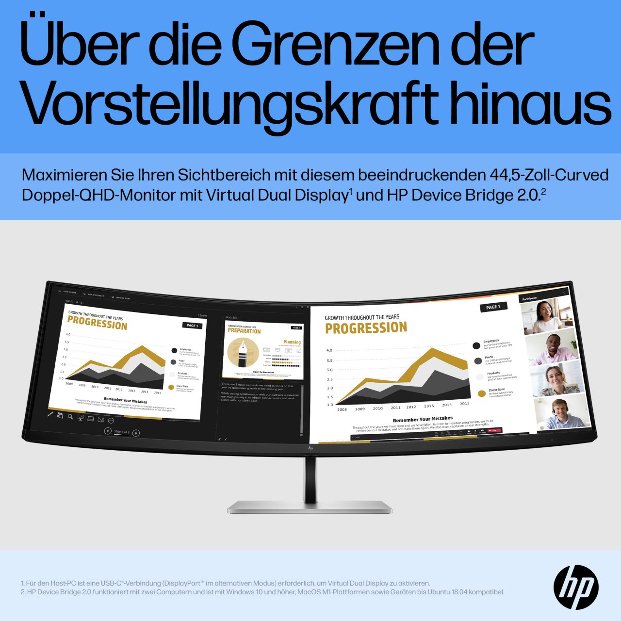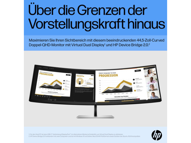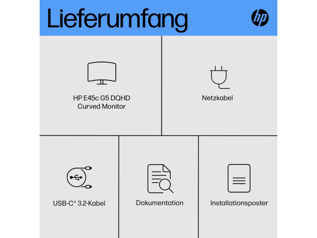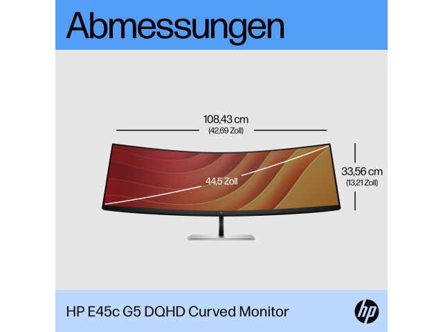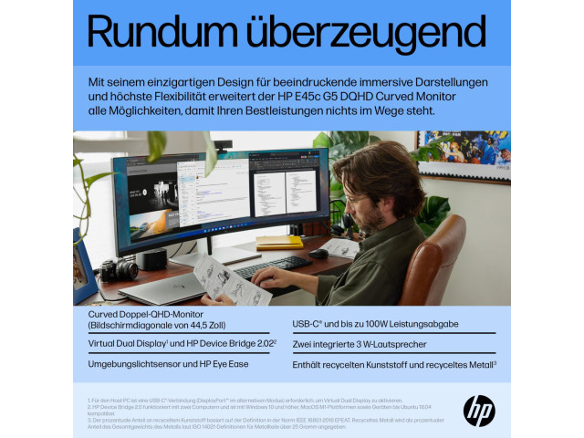 Mit seinem einzigartigen Design für unglaublich immersive Darstellungen und umfassende Flexibilität erweitert der HP E45c G5 DQHD Curved Monitor alle Möglichkeiten, damit Ihren Bestleistungen nichts im Wege steht. Mit seinem stylischen Design ist dieses speziell auf Ihren Komfort und den Schutz der Umwelt abgestimmte ultrabreite Display ein wahres Produktivitätskraftwerk.