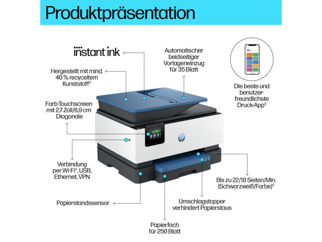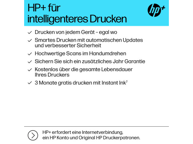 Dies ist ein HP+ fähiger Drucker. Wählen Sie bei der Produkteinrichtung HP+, um von den Vorteilen zu profitieren. HP+ erfordert ein HP Konto, eine unterbrechungsfreie Internetverbindung und die ausschließliche Verwendung von Original HP Druckerpatronen während der gesamten Lebensdauer des Druckers. Mehr Information unter: http://www.hp.com/plus