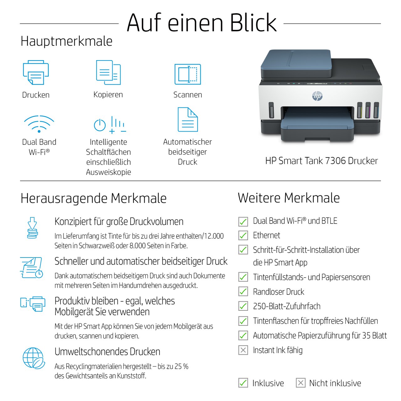 HP Smart Tank 7306 All-in-One Printer Thermal Inkjet A4 4800 x 1200 DPI 15 Seiten pro Minute WLAN