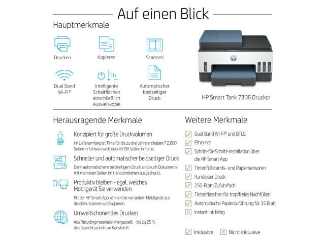 HP Smart Tank 7306 All-in-One; 2 x HP 32XL Schwarz Original Tintenbehälter; HP 31 Cyan Original Tintenbehälter; HP 31 Magenta Original Tintenbehälter; HP 31 Gelb Original Tintenbehälter; HP Schwarzer Druckkopf; HP Dreifarbiger Druckkopf: Flyer mit Sicherheitshinweisen zur Tinte; Flyer mit Umpackungshinweisen; Installationsanleitung; Referenzhandbuch; Flyer mit gesetzlichen Bestimmungen; PT-Flyer; Flyer mit gesetzlichen Angaben zur RoH-EAC; Netzkabel; Flyer zur erweiterten Garantie. Weitere Informationen zu Füllstand und Reichweite finden Sie unter http://www.hp.com/go/learnaboutsupplies
