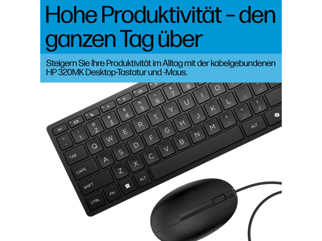 Arbeiten Sie effizient und steigern Sie Ihre Produktivität im Alltag mit der zuverlässigen kabelgebundenen HP 320MK Desktop-Tastatur und -Maus.