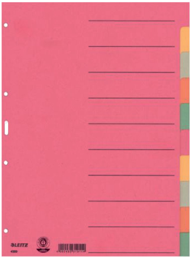 Kartonregister aus extrastarkem 230 g/qm Karton (RC). Deckblatt zur einfachen Beschriftung und farbige Taben für eine bessere Übersichtlichkeit. 4-fach Lochung. Hergestellt aus hochwertigem recyceltem Papier. Umweltzeichen Blauer Engel.
