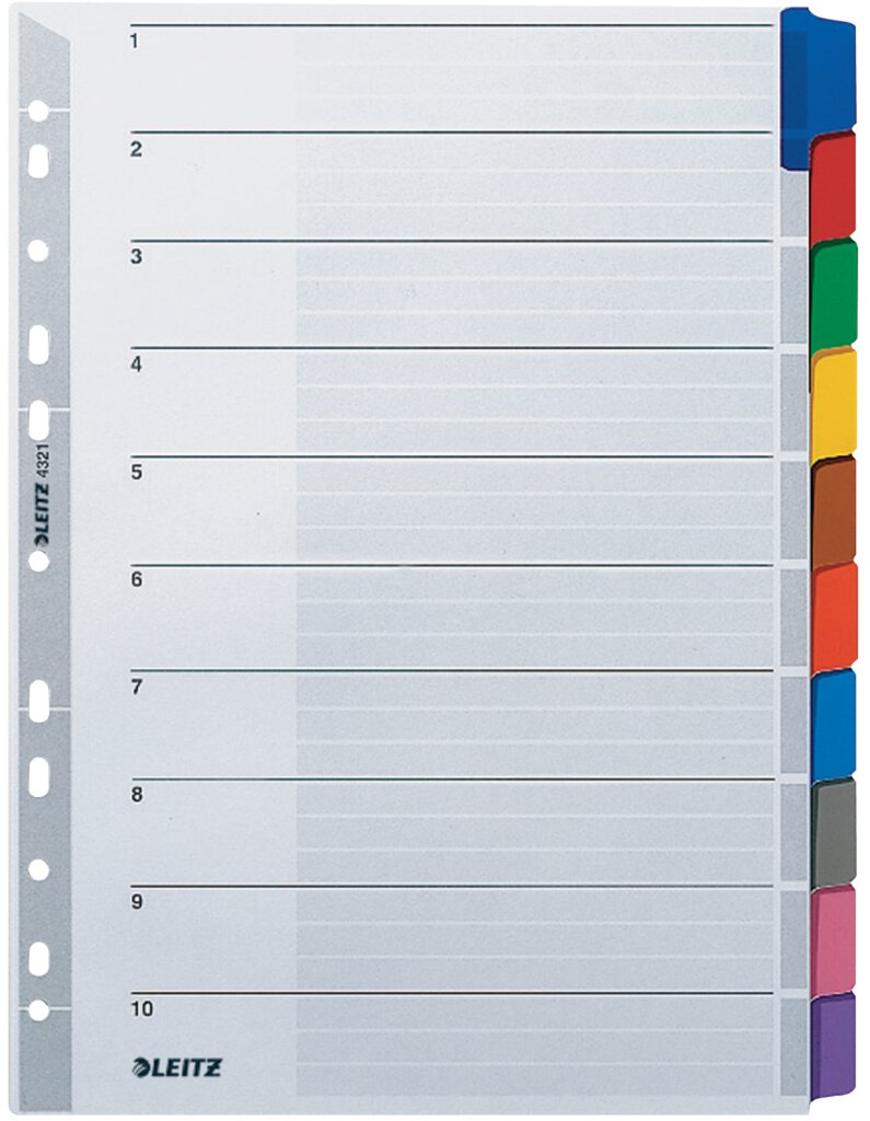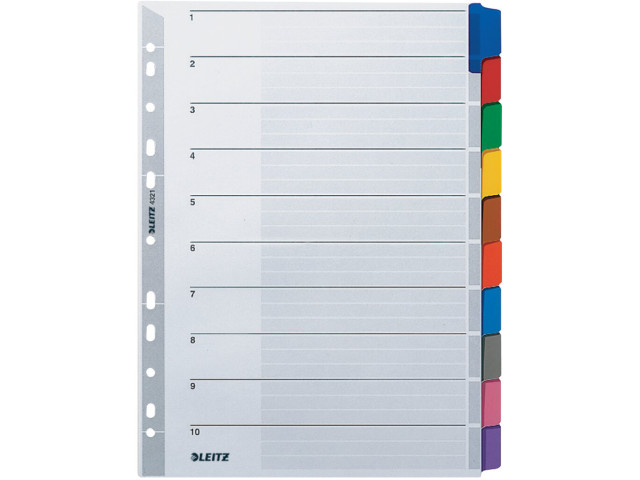 Kartonregister mit 10 farbigen Taben. Tabe und Lochung mit Folie verstärkt, Deckblatt mit Linienaufdruck zur einfachen Beschriftung. Universallochung. Farbe: grau. Aus stabilem 160 g/qm Karton. Format: DIN A4. Maße (H x B): 297 x 225 mm.