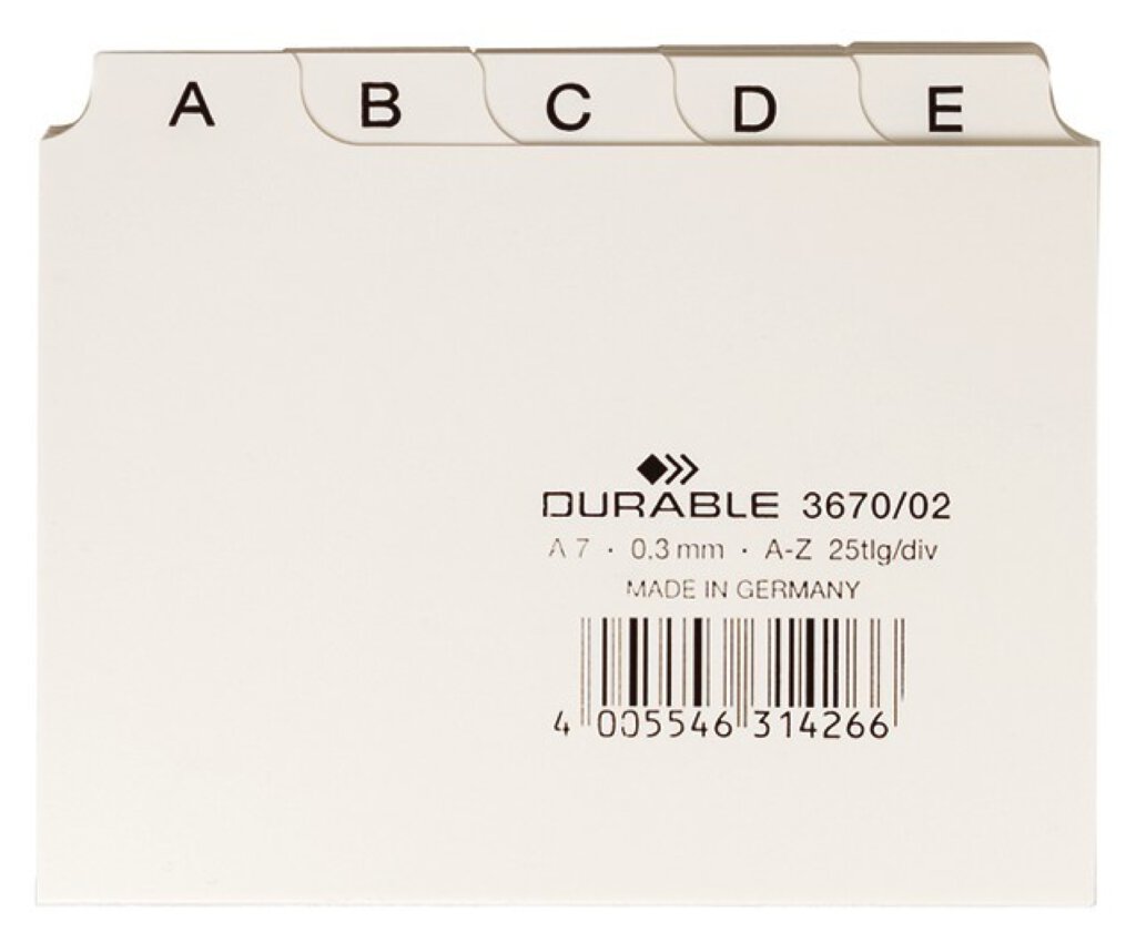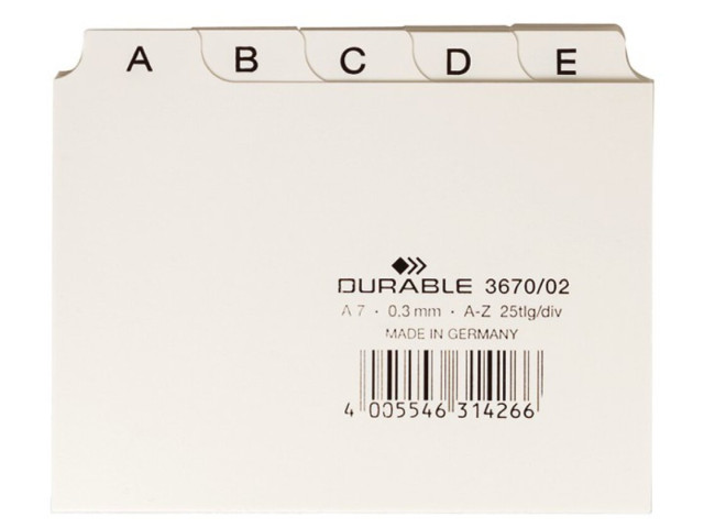Leitkartenregister 25-teilig, A - Z. Geprägte Taben in 5/5-Teilung. Tabrückseite beschriftbar. Zur Verwendung in Karteikkästen und -trögen. Kunststoff. Farbe: weiß.