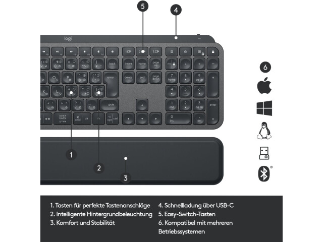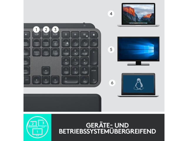 Das MX Keys Wireless Keyboard folgt Ihrer MX Master 3 Advanced Wireless Mouse ̶ oder einer anderen Logitech Flow-fähigen Maus ̶ von einem Computer zum anderen(1). Verbinden Sie die Tastatur einfach via USB-Empfänger oder Bluetooth® mit PC, Smartphone oder Tablet (kompatibel mit macOS, Windows, Linux, iOS und Android). Wechseln Sie dabei zwischen bis zu 3 Geräten (PC, Laptop, Tablet) mit einem einfachen Tastendruck und mit einer Reichweite von 10 Metern(4).