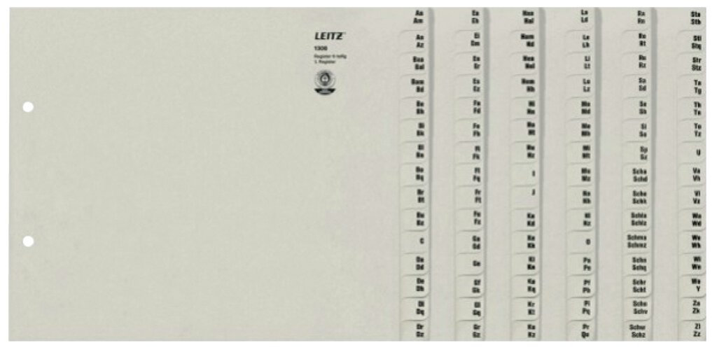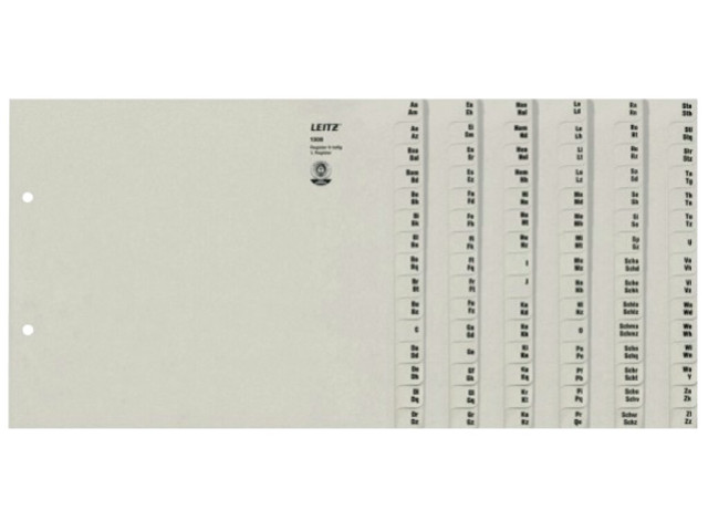 Registerserien zur alphabetischen Ablage. Robustes Tegister aus Tauenpapier 100 g/qm (RC). Die bedruckten Taben sorgen für ein schnelles Sortieren und Wiederfinden. Jeder Vorgang liegt hinter der entsprechenden Buchstabenkombination. Mit Lochverstärkung des ersten Blattes. 6 Abläufe à 15 Blatt für 6 Ordner, 2-fach Lochung, Format: DIN A4 halbe Höhe. Maße (H x B): 240 x 200 mm.