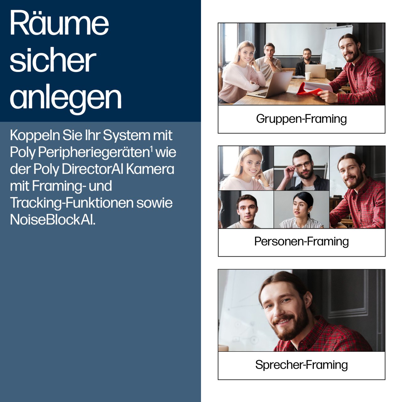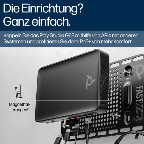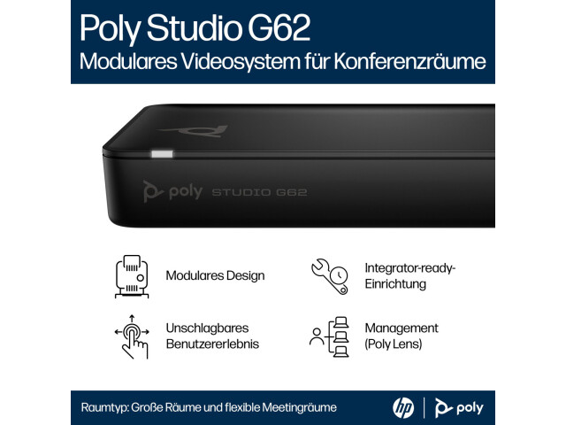 Das Poly Studio G62 Konferenzsystem bietet eine einfache Einrichtung, nahtlose Integration und die nötigen Anpassungsmöglichkeiten. Tools zur leistungsstarken Zusammenarbeit? Kein Problem. Fortschrittliche audiovisuelle Funktionen? Absolut. Eine flexible Einrichtung? Alles schon mit drin.[1]