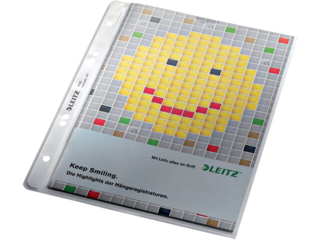 Prospekthülle aus PP-Folie, oben offen, Folie genarbt. Dokumentenecht, 4-fach Lochung. Mit Einreißschutz (4725, 4720). Mit Daumenausschnitt (4700, 4723). Folienstärke: 130 my.