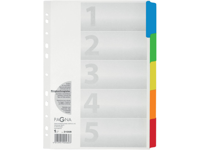 Kartonregister, farbige Taben und Lochung mit Polyester-Folie verstärkt. Mit Universallochung und beschriftbarem Deckblatt. Format: DIN A4. Farbe: weiß.
