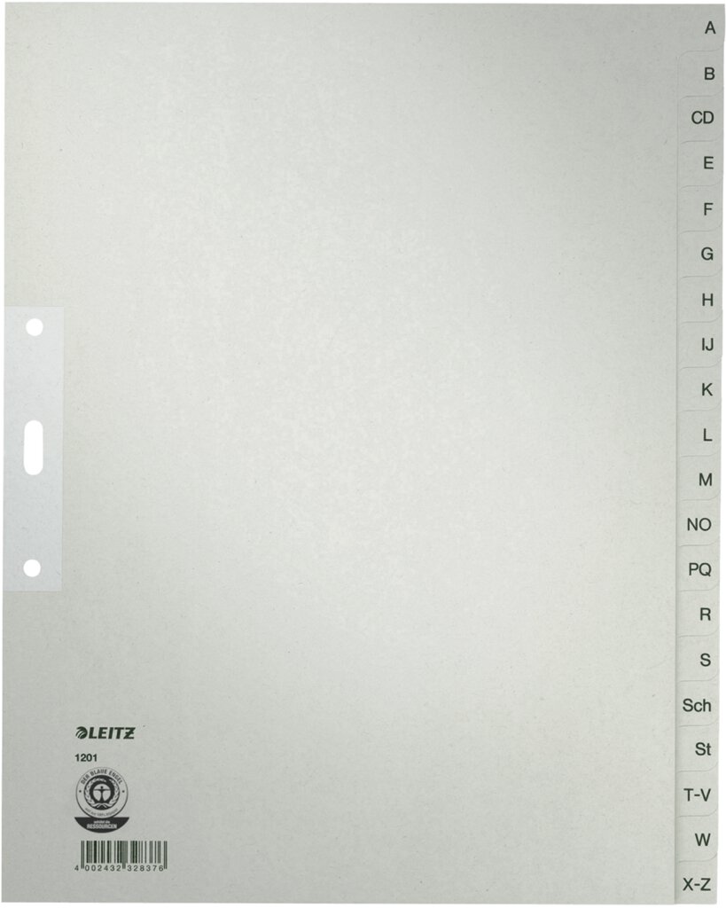Robustes Register aus Tauenpapier 100 g/qm. Lochverstärkung des 1. Blattes. Farbe: hellgrau. Hergestellt aus hochwertig recyceltem Papier. Umweltzeichen Blauer Engel.