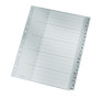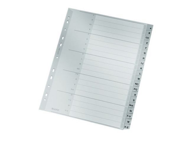 Register aus PP-Folie (0,12 mm) mit beschriftbarem Deckblatt aus Karton 250 g/qm, 20-teilig. Überbreite: zur Nutzung mit Prospekthüllen geeignet (außer LEI1265). Universallochung. Farbe: grau.