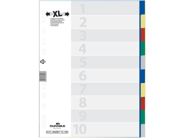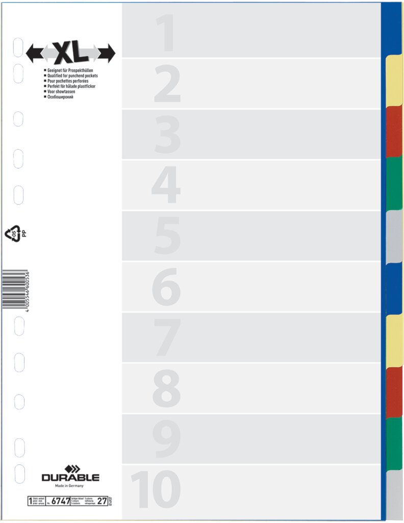 Register aus PP. Mit farbigen Taben zur besseren Unterteilung. EDV-beschriftbares Deckblatt (Vorlagen auf www.duraprint.de). Universallochung. Format: DIN A4, volldeckend. Maße (H x B): 297 x 210/220 mm (außer DUR6747 /A4+)