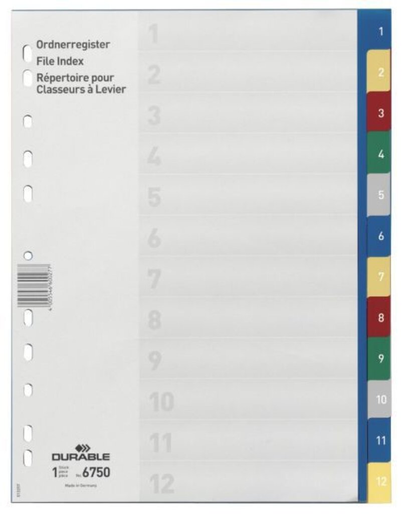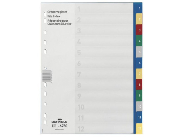 Register aus PP. Mit farbigen Taben zur besseren Unterteilung. EDV-beschriftbares Deckblatt (Vorlagen auf www.duraprint.de). Universallochung. Format: DIN A4, volldeckend. Maße (H x B): 297 x 210/220 mm (außer DUR6747 /A4+)