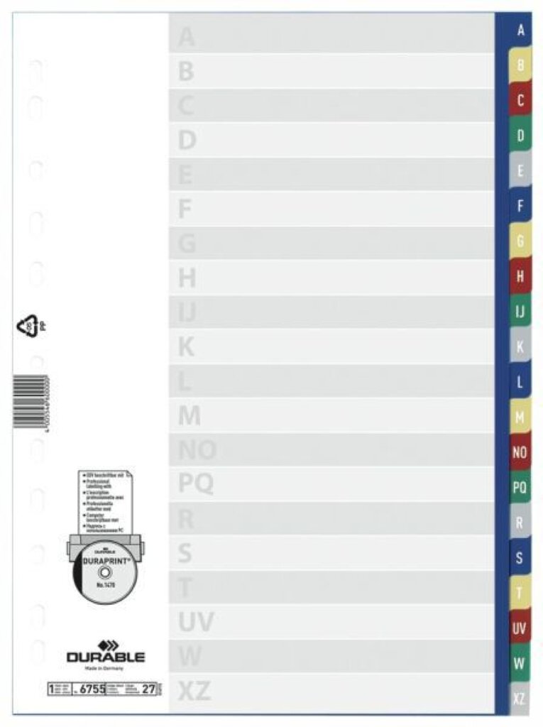 Register aus PP. Mit farbigen Taben zur besseren Unterteilung. EDV-beschriftbares Deckblatt (Vorlagen auf www.duraprint.de). Universallochung. Format: DIN A4, volldeckend. Maße (H x B): 297 x 210/220 mm (außer DUR6747 /A4+)