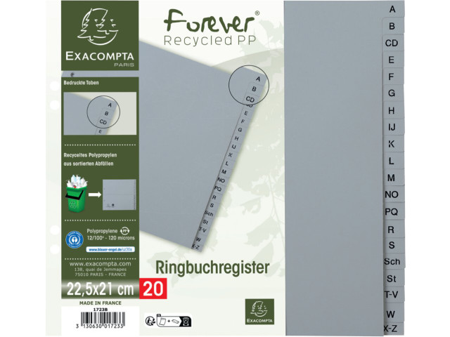 Register, Recycling-PP, A-Z, DIN A4, 20 Taben, 2/3 Höhe, grau, Blauer Engel