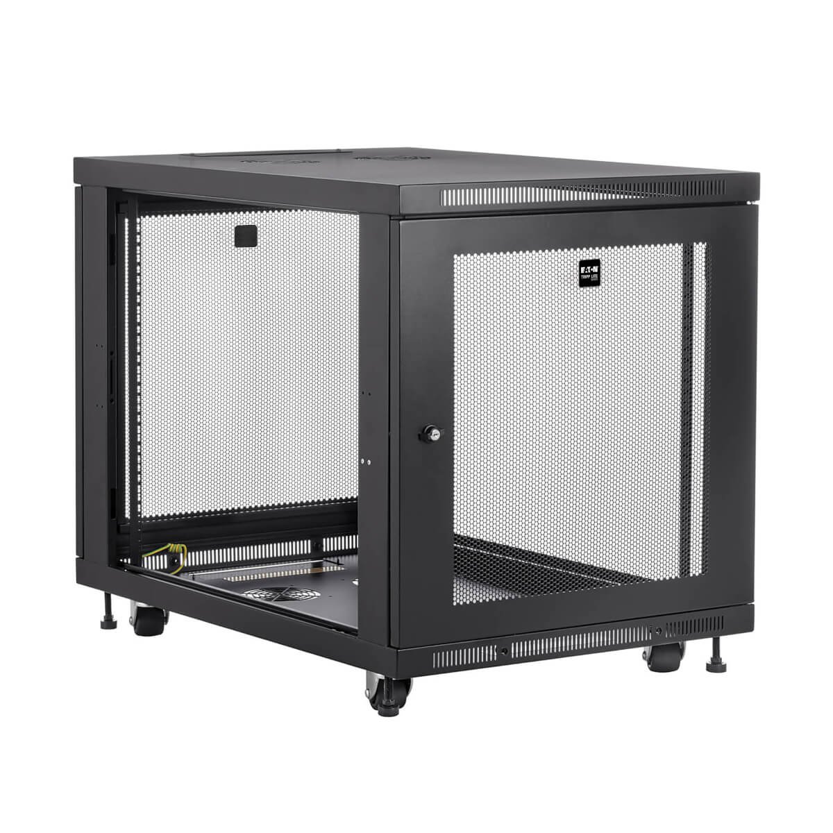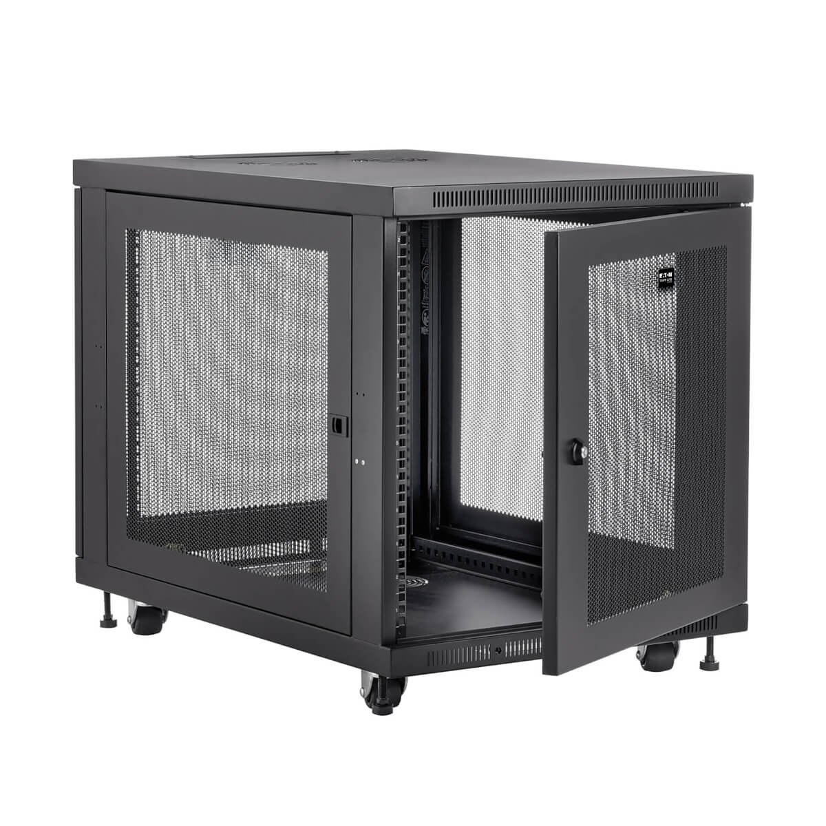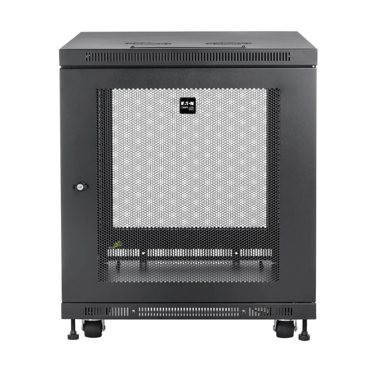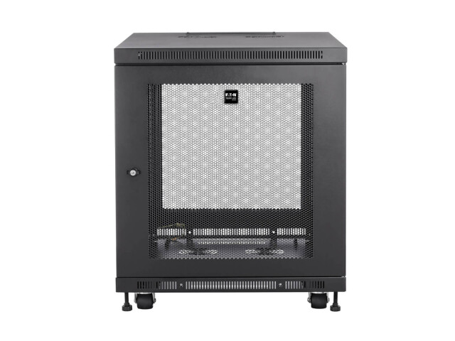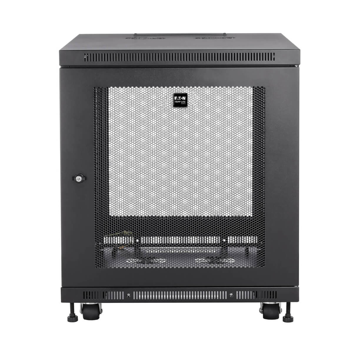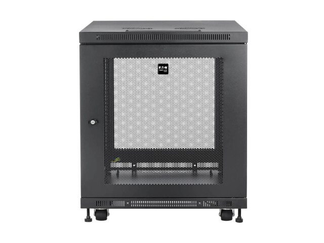 Der SmartRack 12-HE mitteltiefe Rack-Gehäuseschrank von Tripp Lite wurde entwickelt, um die Installation und Wartung von Rackgeräten zu vereinfachen. Er ist mit allen standardmäßigen 19-Zoll-Rackgeräten kompatibel und verfügt über vordere und hintere vertikale Schienenpaare mit quadratischen Befestigungslöchern. Die Schienen sind in Viertelzoll-Schritten verstellbar, um Geräte mit einer Tiefe von 3 (7,62 cm) bis 32,5 Zoll (82,55 cm) aufzunehmen, ideal für die Standard-Serverinstallation. Die Schienen können bis zu 453,6 kg schwere Geräte tragen. Die obere und untere Platte sind mit Eingängen für die Kabelführung und mit Lüftungsöffnungen versehen, die dazu dienen, warme Luft aus dem Gehäuse zu entfernen und kalte Luft durch Konvektion anzusaugen. Die Platten unterstützen auch die Installation von standardmäßigen, vom Benutzer bereitgestellten Gehäuselüftern (Tripp Lite SRFANWM). Mit einer verschließbaren, umkehrbaren Front-/Rücktür und verriegelbaren, abnehmbaren Seitenverkleidungen sorgt das SR12UB für die sichere Installation aller Geräte. Um den Einsatz zu vereinfachen, wird das SR12UB mit einem Zubehörsatz für Nachlaufrollen geliefert, so dass es leicht an den gewünschten Ort verschoben und durch Einstellen der Nivellierer der Einheit an Ort und Stelle gesichert werden kann. Es wird vollständig montiert geliefert, um eine schnelle Installation zu ermöglichen.