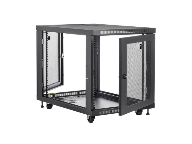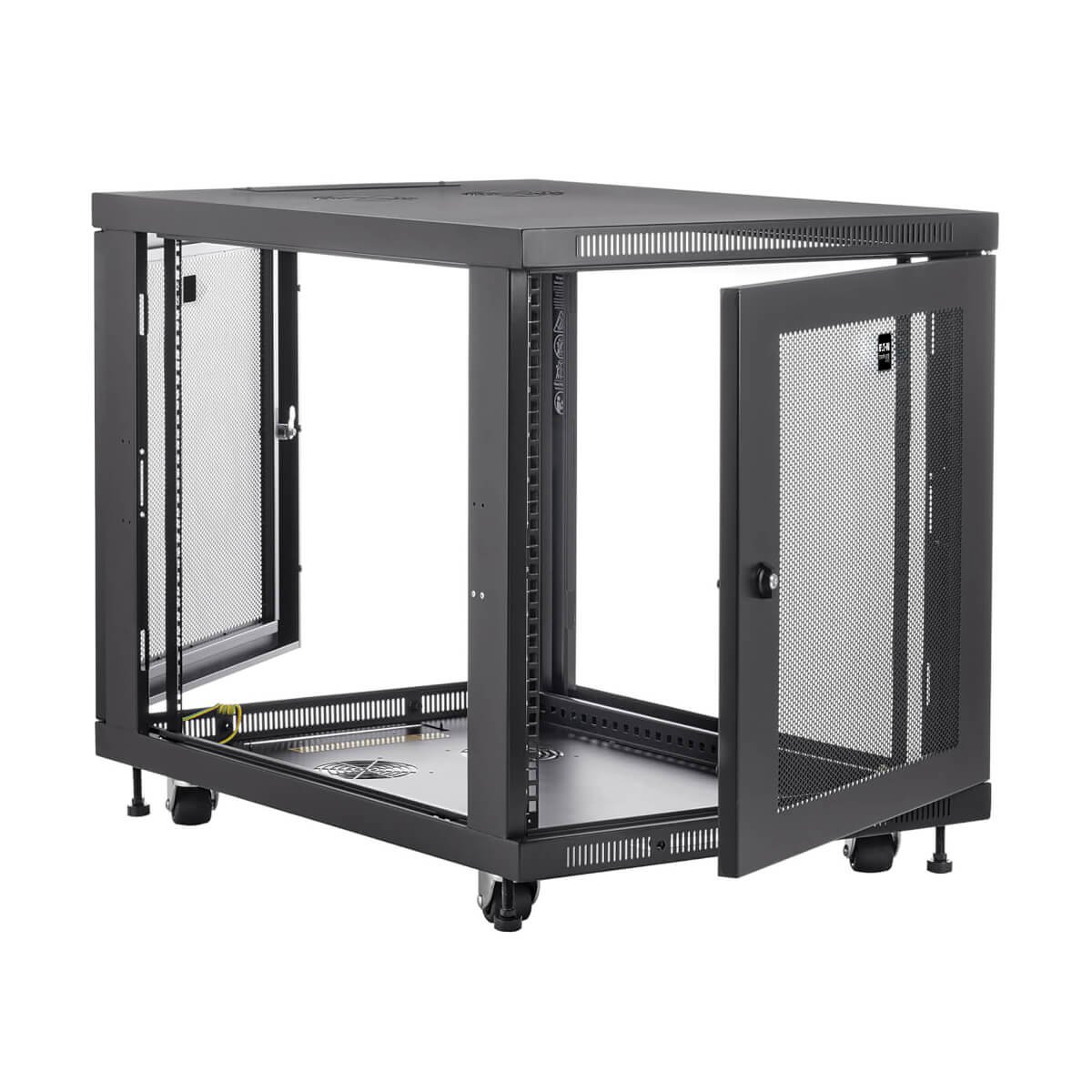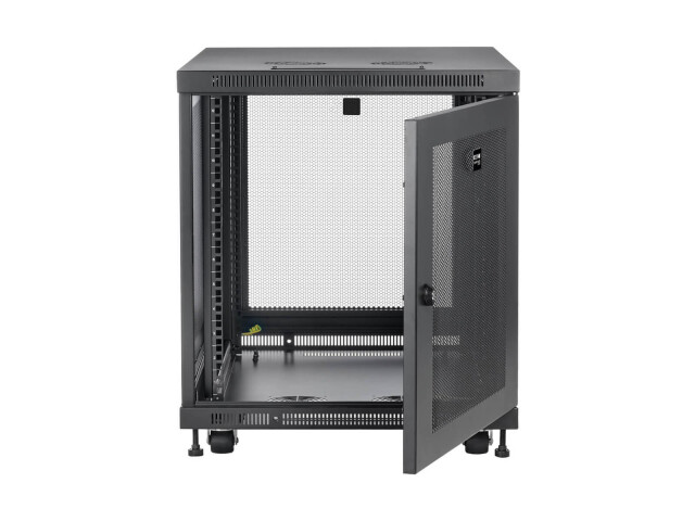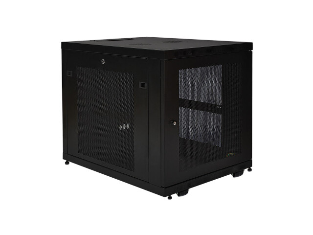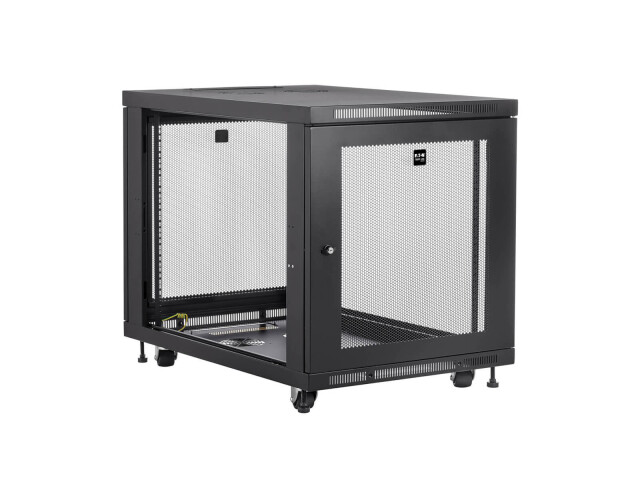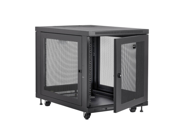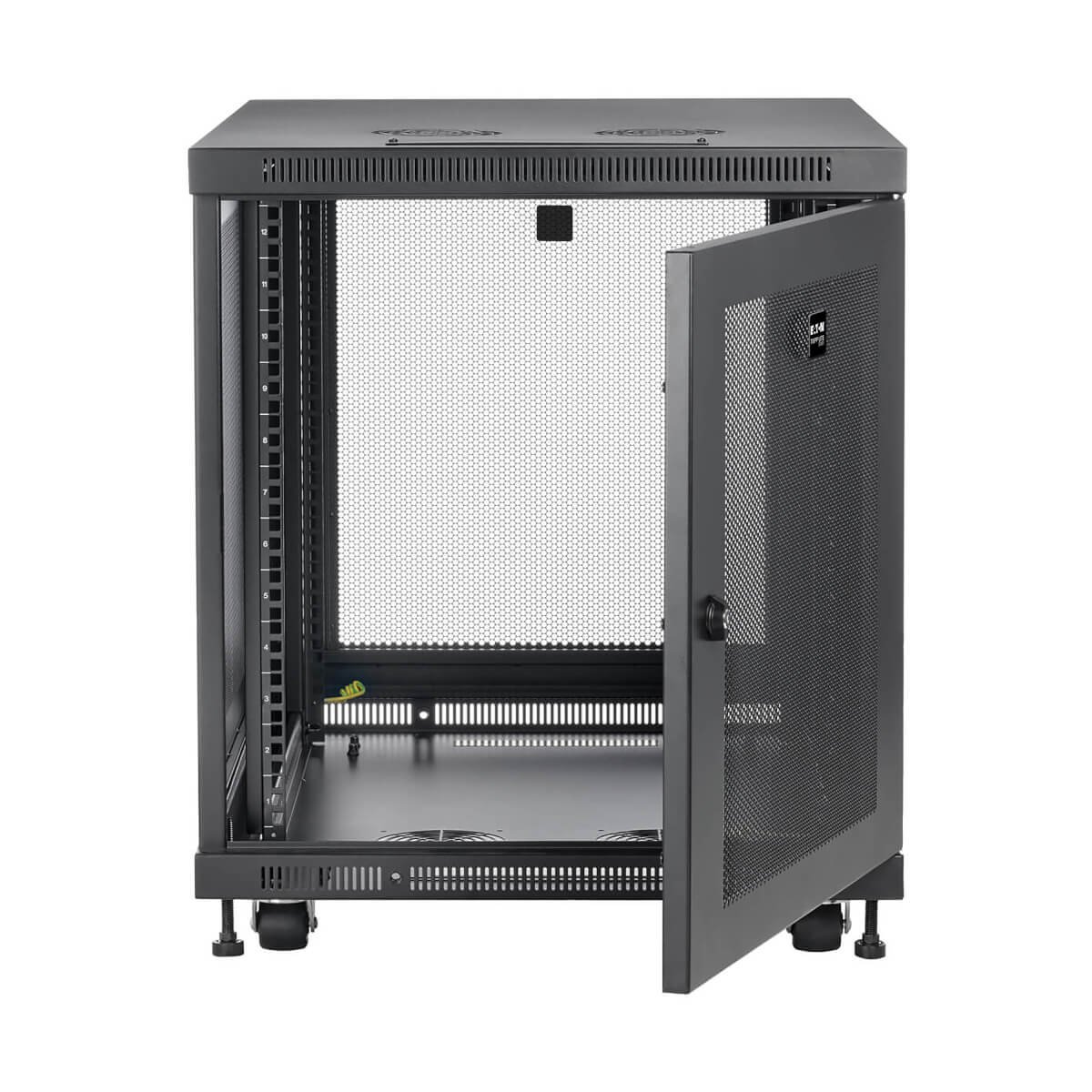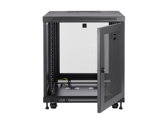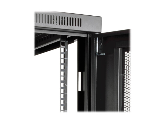 Der SmartRack 12-HE mitteltiefe Rack-Gehäuseschrank von Tripp Lite wurde entwickelt, um die Installation und Wartung von Rackgeräten zu vereinfachen. Er ist mit allen standardmäßigen 19-Zoll-Rackgeräten kompatibel und verfügt über vordere und hintere vertikale Schienenpaare mit quadratischen Befestigungslöchern. Die Schienen sind in Viertelzoll-Schritten verstellbar, um Geräte mit einer Tiefe von 3 (7,62 cm) bis 32,5 Zoll (82,55 cm) aufzunehmen, ideal für die Standard-Serverinstallation. Die Schienen können bis zu 453,6 kg schwere Geräte tragen. Die obere und untere Platte sind mit Eingängen für die Kabelführung und mit Lüftungsöffnungen versehen, die dazu dienen, warme Luft aus dem Gehäuse zu entfernen und kalte Luft durch Konvektion anzusaugen. Die Platten unterstützen auch die Installation von standardmäßigen, vom Benutzer bereitgestellten Gehäuselüftern (Tripp Lite SRFANWM). Mit einer verschließbaren, umkehrbaren Front-/Rücktür und verriegelbaren, abnehmbaren Seitenverkleidungen sorgt das SR12UB für die sichere Installation aller Geräte. Um den Einsatz zu vereinfachen, wird das SR12UB mit einem Zubehörsatz für Nachlaufrollen geliefert, so dass es leicht an den gewünschten Ort verschoben und durch Einstellen der Nivellierer der Einheit an Ort und Stelle gesichert werden kann. Es wird vollständig montiert geliefert, um eine schnelle Installation zu ermöglichen.