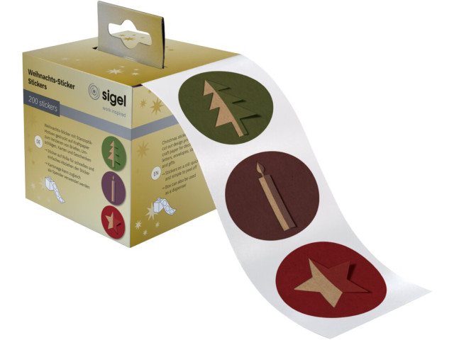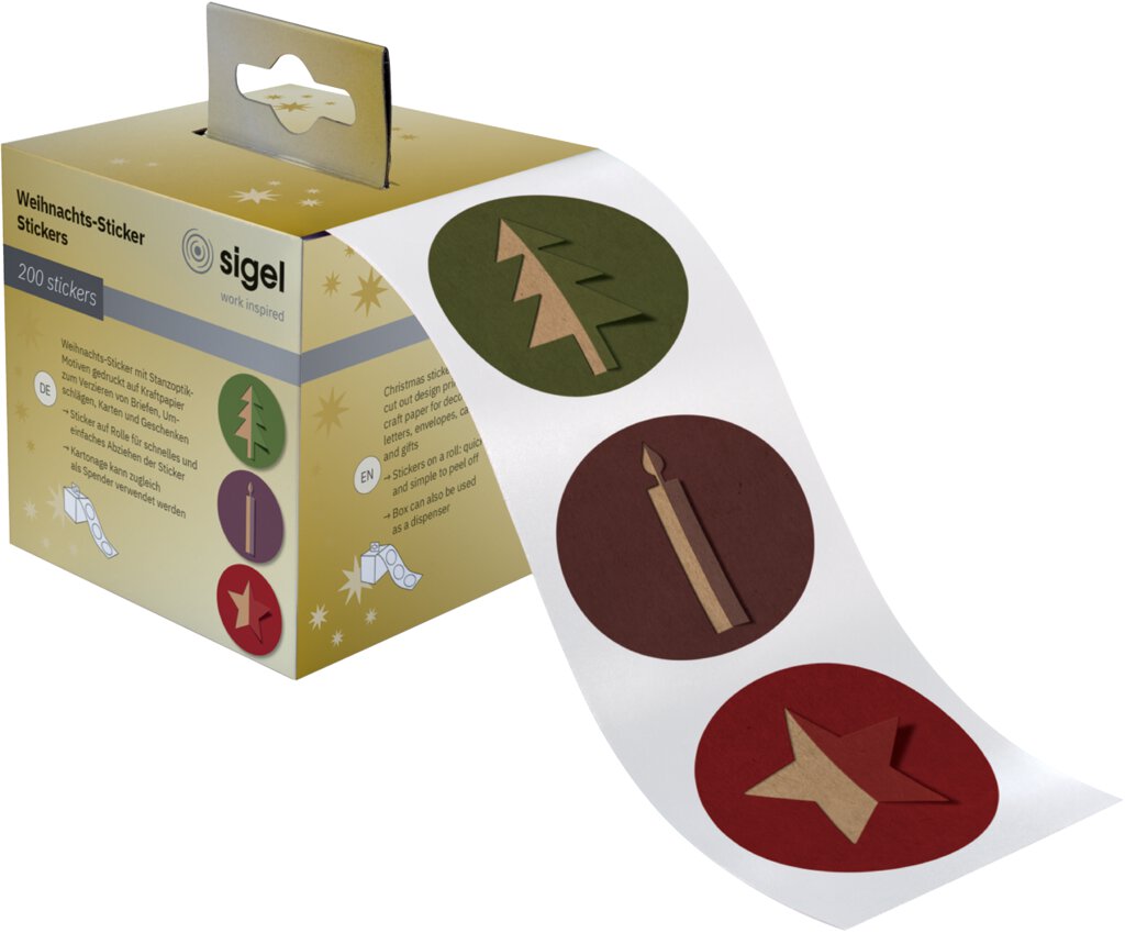 Weihnachtssticker auf Rolle. Verschiedene Motive. In einer Spenderbox.