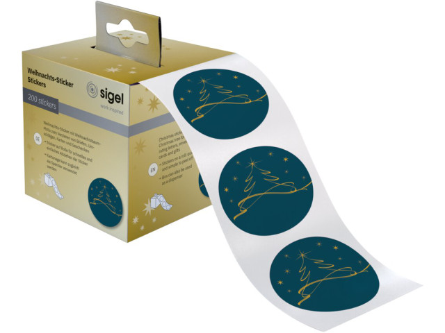 Weihnachts-Sticker auf Rolle Christmas Tree, petrol, in Spenderbox, 47x47mm